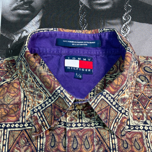 Vintage 90s Tommy Hilfiger All Over Print Half Sleeve Button Up Tee SZ L