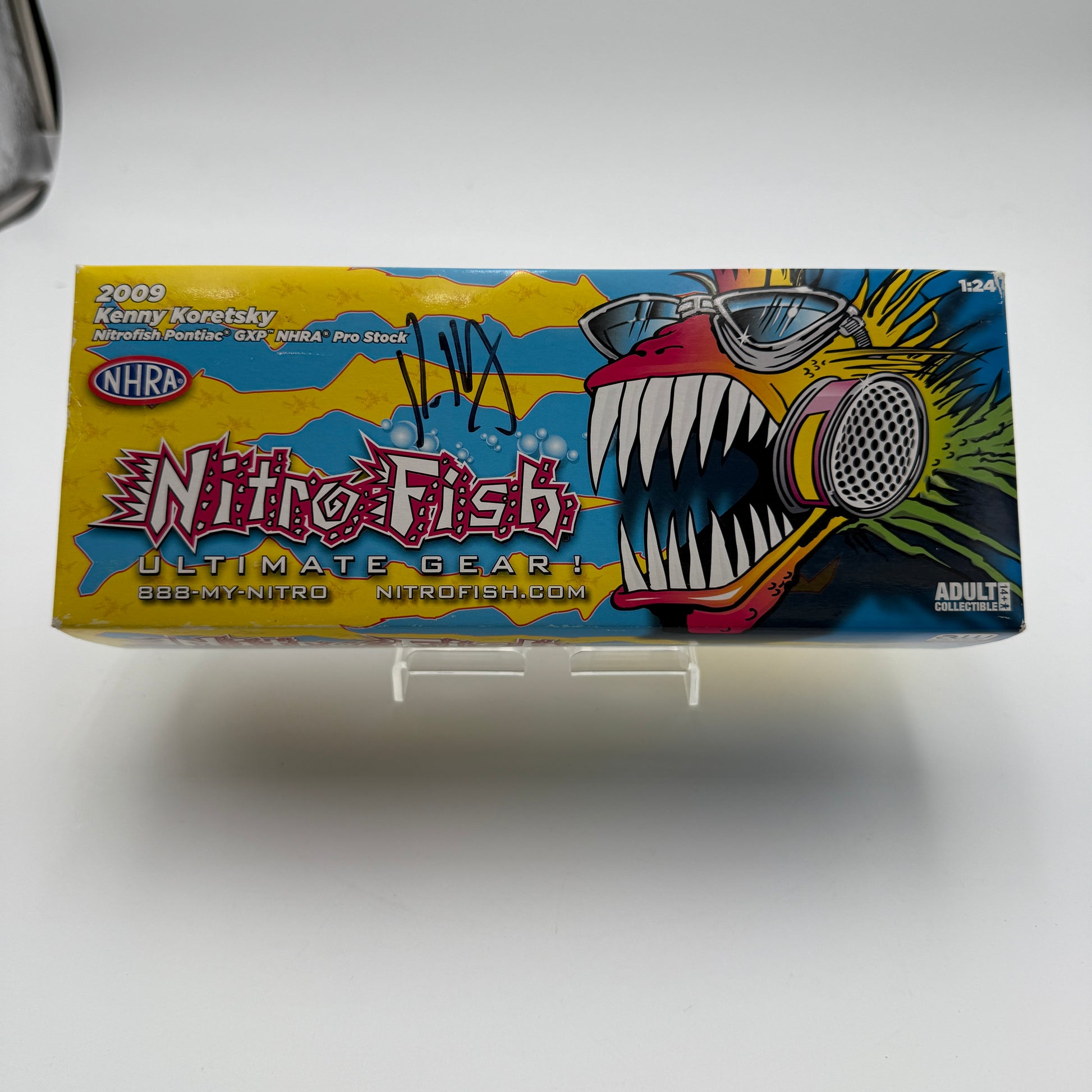 For collectors and racing enthusiasts alike, this limited edition 1:24 scale diecast model of the SIGNED 2005 Dodge Stratus Nitro Fish, driven by Kenny Koretsky, is a must-have item. With vibrant multi-colored detailing, this model brings the excitement of NHRA racing straight to your collection.